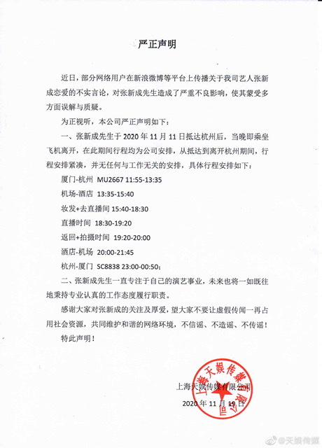 而經紀公司也在晚上發了官方聲明,將張新成的行程一一交代清楚,譴責造謠!
