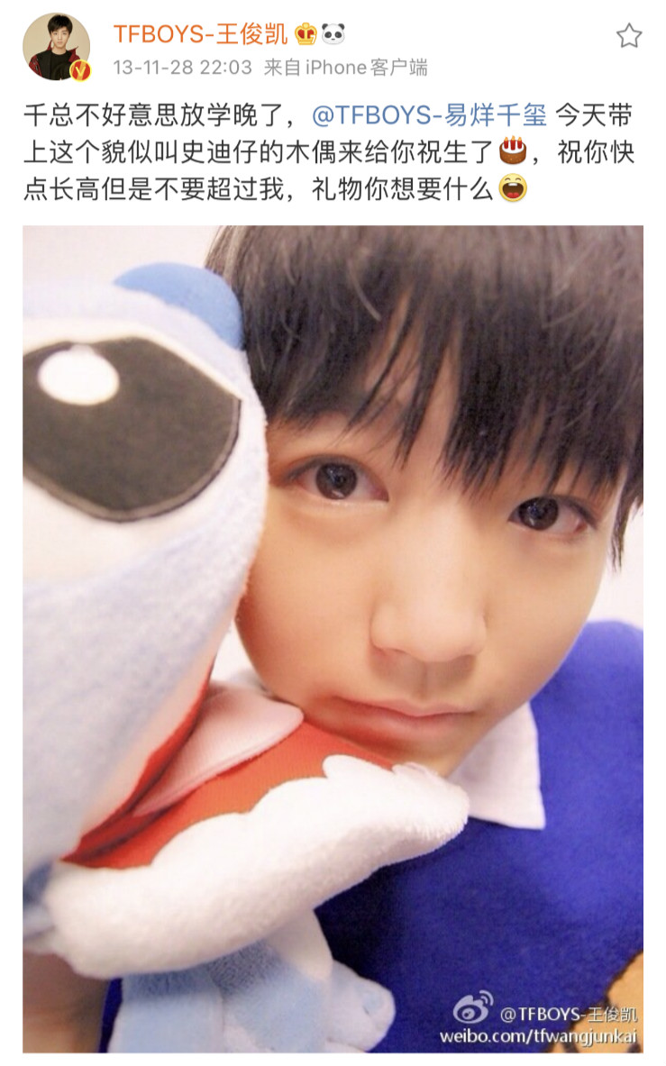 小編最喜歡看小時候的祝福,真的可愛值滿滿!13歲時,王俊凱送的生日祝福是:「千總不好意思放學晚了,@TFBOYS-易烊千璽今天帶上這個貌似叫史迪仔的木偶來給你祝生了[蛋糕],祝你快點長高但是不要超過我,禮物你想要什麼[哈哈]」敲可愛有沒有!