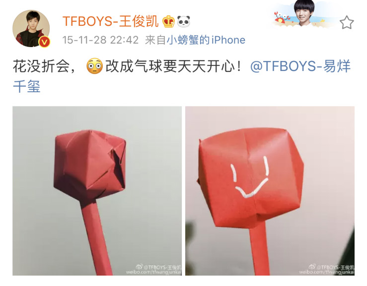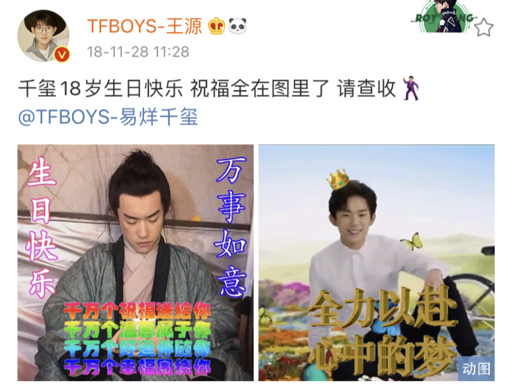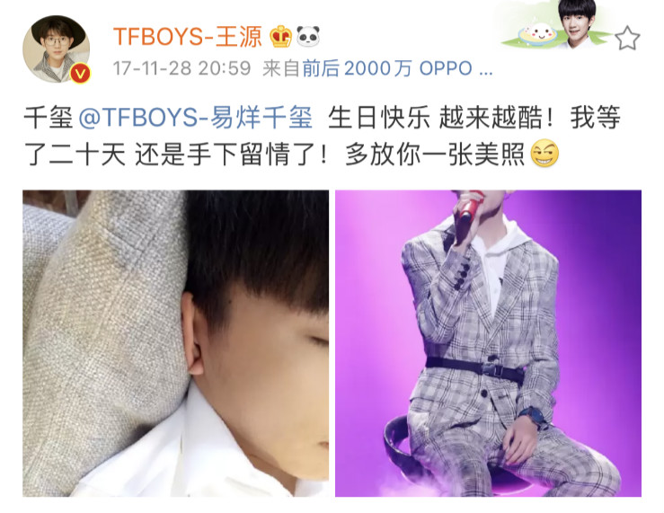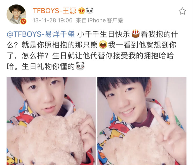 一樣,來考古13歲的王源送給13歲的小千千的祝福,還是個「別人生日我po自拍」的年紀:「小千千生日快樂[蛋糕]看我抱的什麼? 就是你照相抱的那隻熊[哈哈]我一看到他就想到你了,怎麼樣? 生日就讓他代替你接受我的擁抱哈哈哈。 生日禮物你懂的[熊貓]」