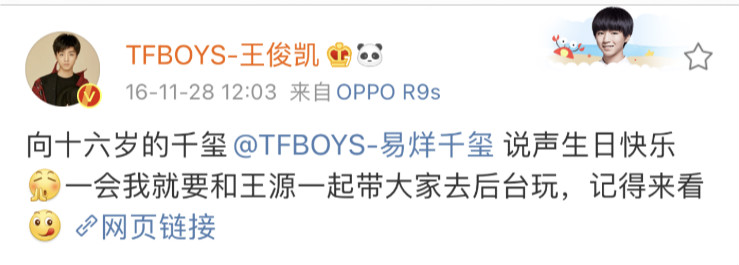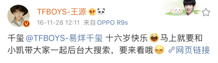 16歲的生日都是直播預告,表示:「向十六歲的千璽@TFBOYS-易烊千璽 說聲生日快樂[鼓掌]一會我就要和王源一起帶大家去後台玩,記得來看」