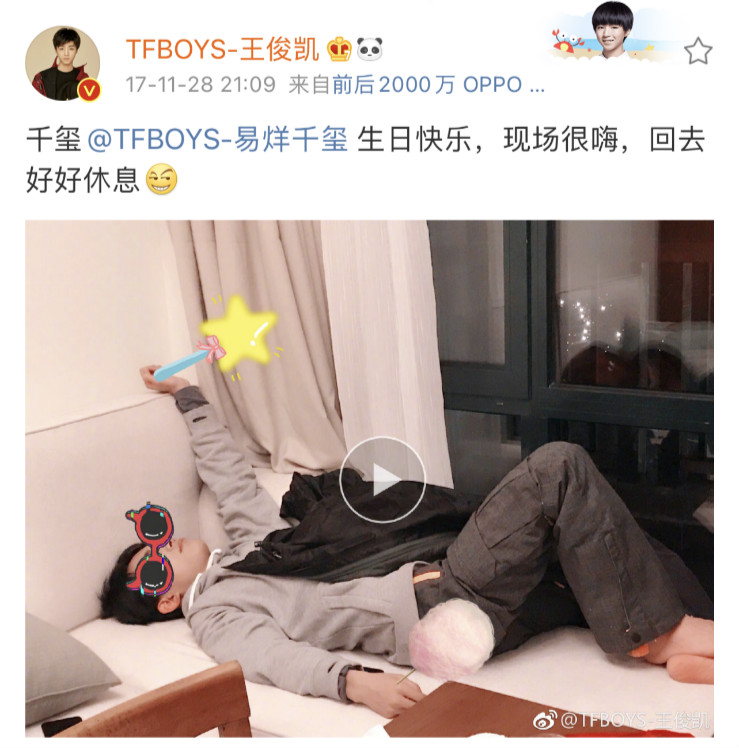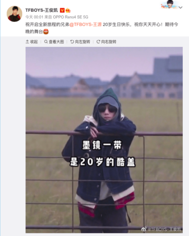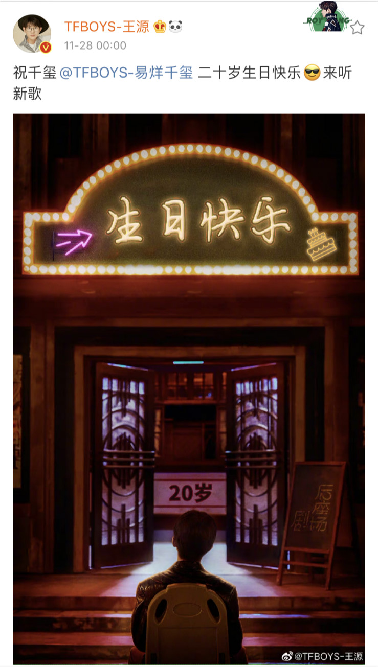 至於王源每年送的禮物,都喜歡在照片上放心思,今年放出的是千璽的《後座劇場》圖:「祝千璽@TFBOYS-易烊千璽 二十歲生日快樂😎來聽新歌!」
