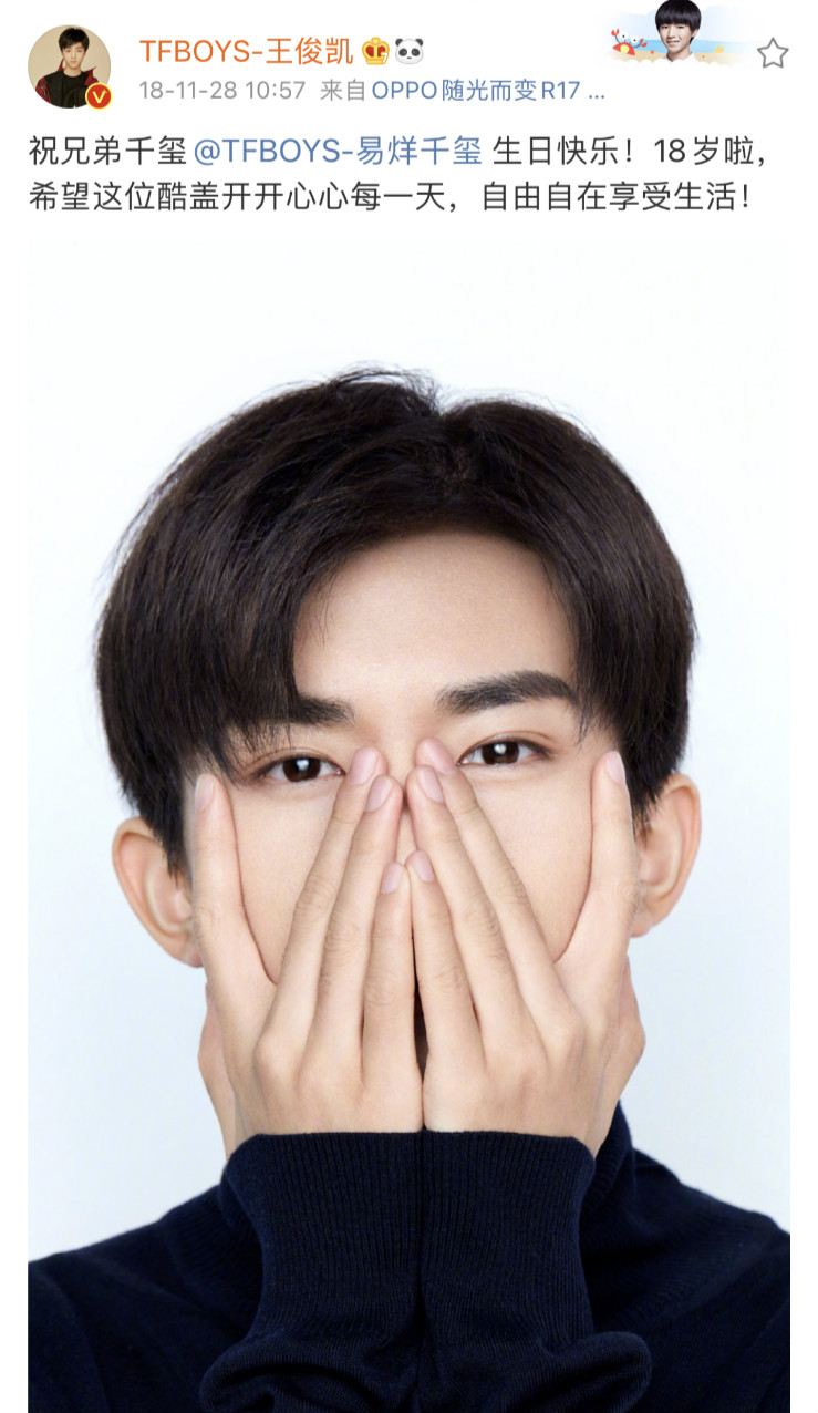 18歲的祝福是:「祝兄弟千璽@TFBOYS-易烊千璽 生日快樂!18歲啦,希望這位酷蓋開開心心每一天,自由自在享受生活!」