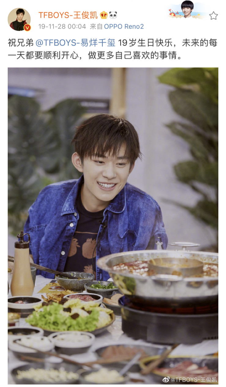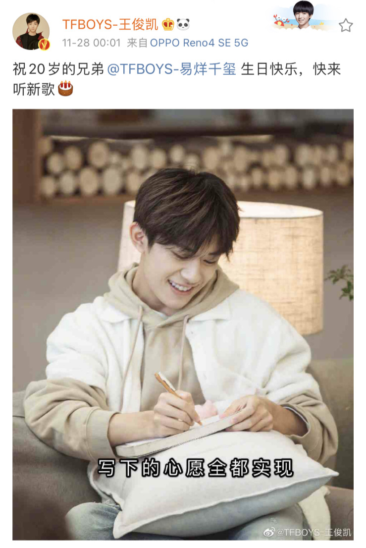 而19歲時,王俊凱送上的祝福是:「祝兄弟@TFBOYS-易烊千璽 19歲生日快樂,未來的每一天都要順利開心,做更多自己喜歡的事情。」