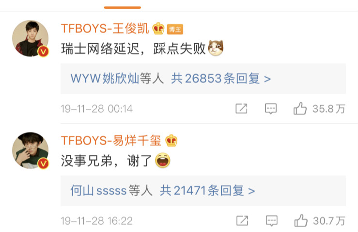 但千璽19歲生日這一天,由於王俊凱身在國外,還特別在評論追加表示:「瑞士網絡延遲,踩點失敗!」也只遲了4分鐘啊!我們千璽回復:「沒事兄弟,謝了!」