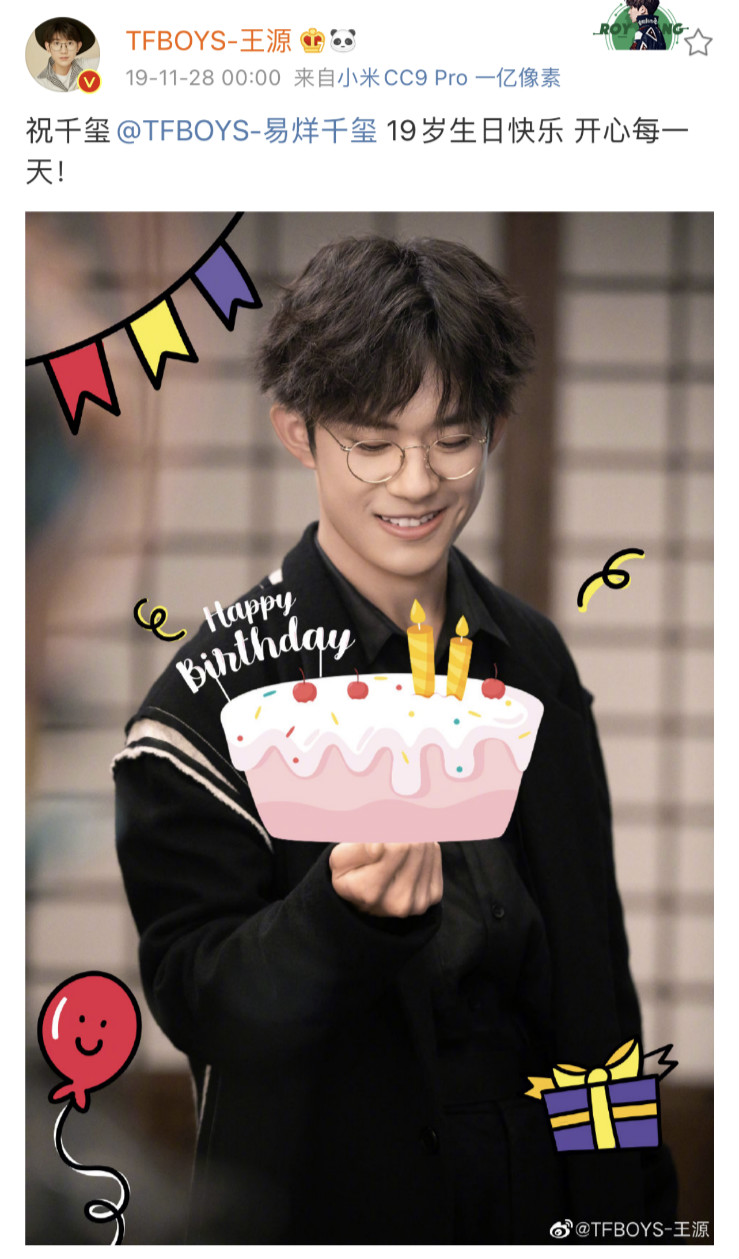 19歲時送上的是幫千璽P了蛋糕的照片:「祝千璽@TFBOYS-易烊千璽 19歲生日快樂 開心每一天!」