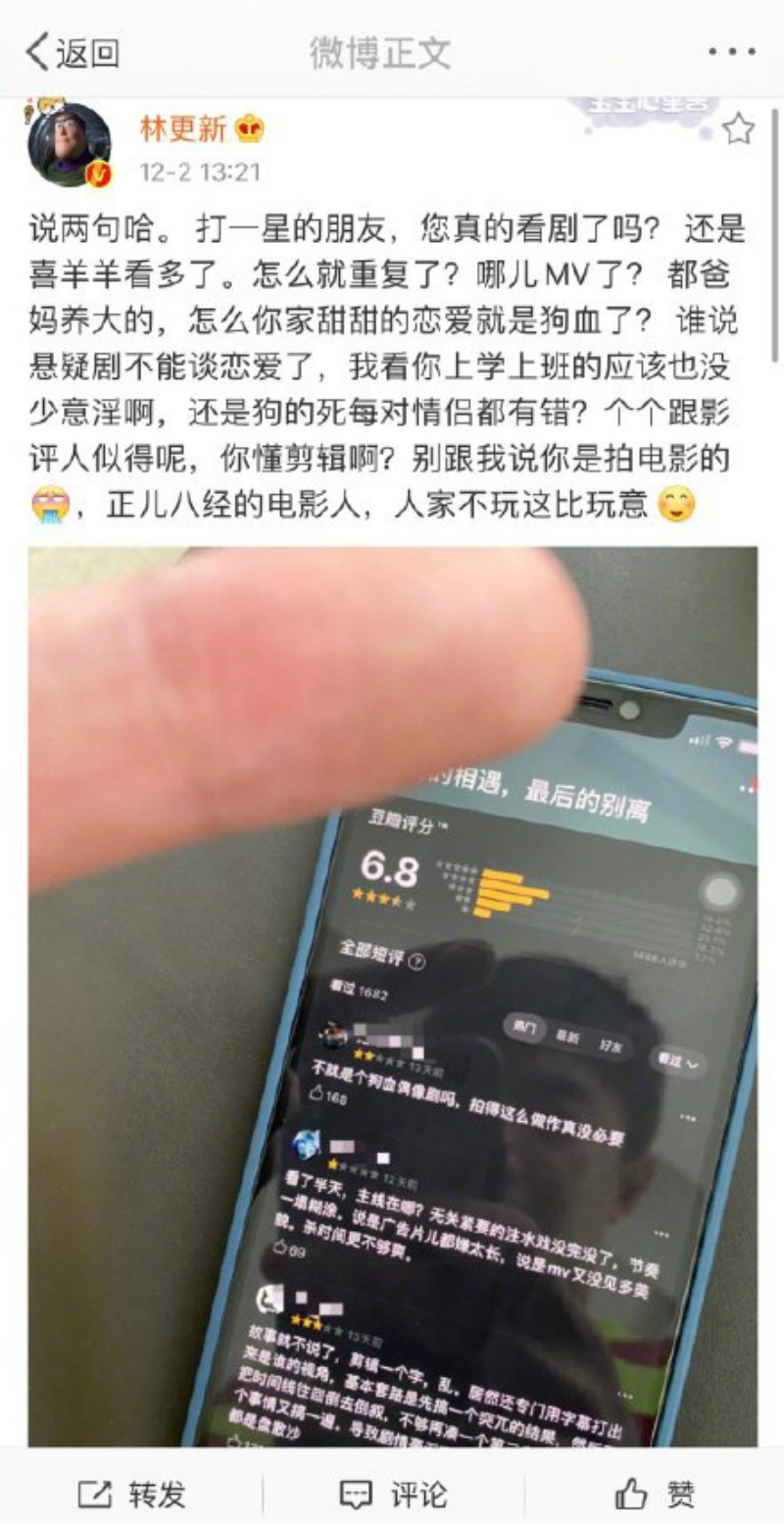 而且林更新在文中提到:「個個跟影評人似的,你懂剪輯啊。」,也讓不少網友質疑,難道非專業出身的觀衆,就不能討論劇情了嗎?於是…這篇文帶來的後果,就是這部劇的評分在不到一小時內,從6.8直接跌到6.0!