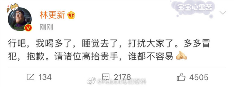 於是…倔強如林更新也認慫了,火速刪掉之前的動態,並發文向公衆道歉:「行吧,我喝多了,睡覺去了,打擾大家了。多多冒犯,抱歉。請諸位高擡貴手,誰都不容易」