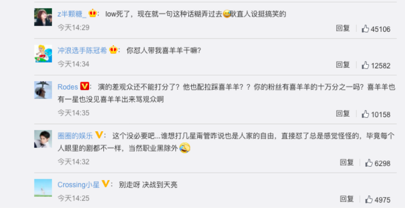但網友似乎並不認同,評論區熱評都是:「low死了,現在就一句這種話糊弄過去😅耿直人設挺搞笑的」、「你怼人帶我喜羊羊幹嘛?」、「演的差觀衆還不能打分了?他也配拉踩喜羊羊??你的粉絲有喜羊羊的十萬分之一嗎?喜羊羊也有一星也沒見喜羊羊出來罵觀衆啊!」、「這個沒必要吧…誰想打幾星甭管咋說也是人家的自由,直接怼了總是感覺怪怪的,畢竟每個人眼裏的劇都不一樣,當然職業黑除外!」、「別走呀!決戰到天亮!」