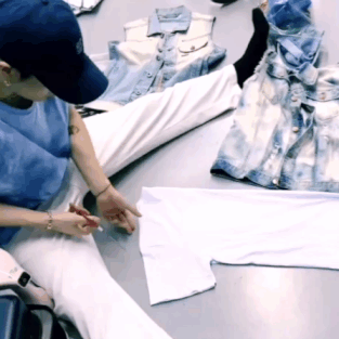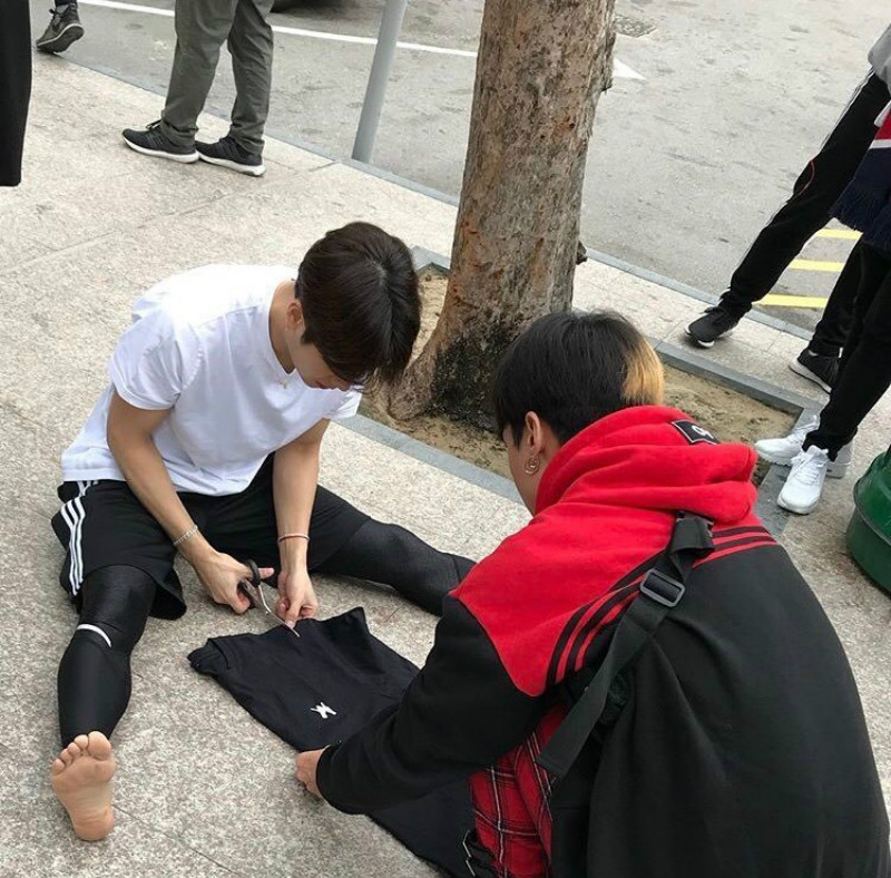 眾所周知,王嘉爾最喜歡舊衣新穿,穿過的舊衣服絕對不會就這麼丟掉,嘎嘎總有各種小辦法讓衣服變得有自己的style,其中一個就是…剪一刀試試?於是,簡單的舊T恤,對折之後,直接剪掉袖口就變成了一件截然不同的背心!