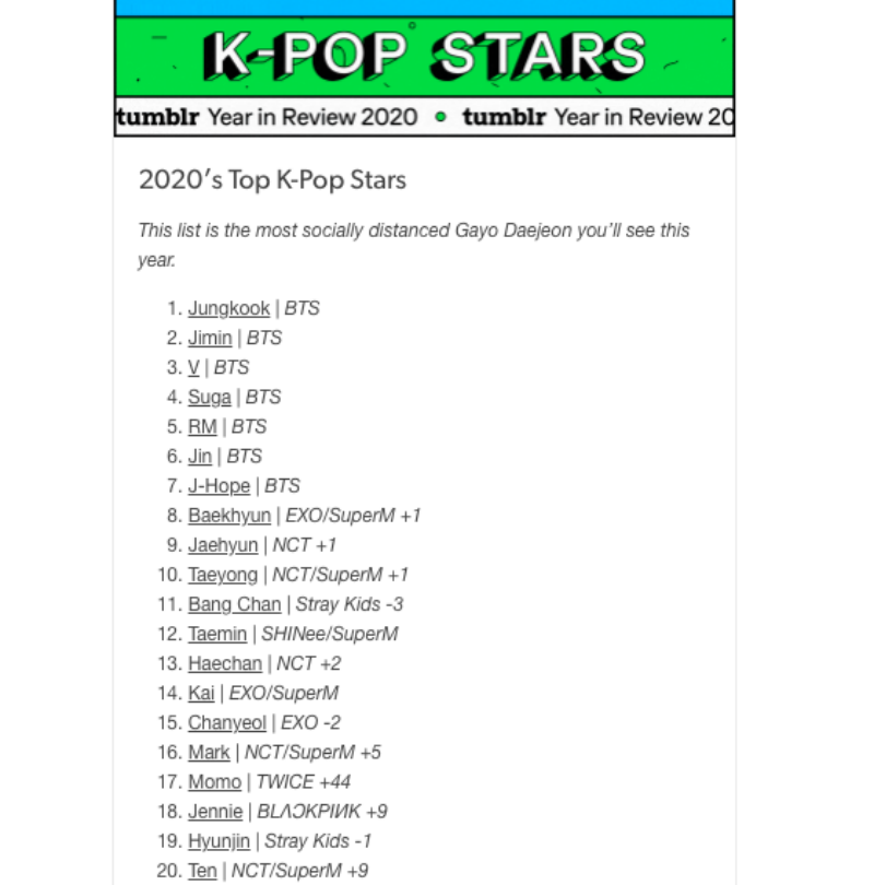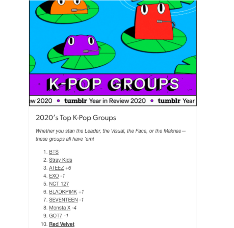 是噠!一年一度Tumblr的年度排行榜又來啦!究竟今年誰會成為Tumblr上熱度最高的KPOP團體和藝人呢?立刻看成績!