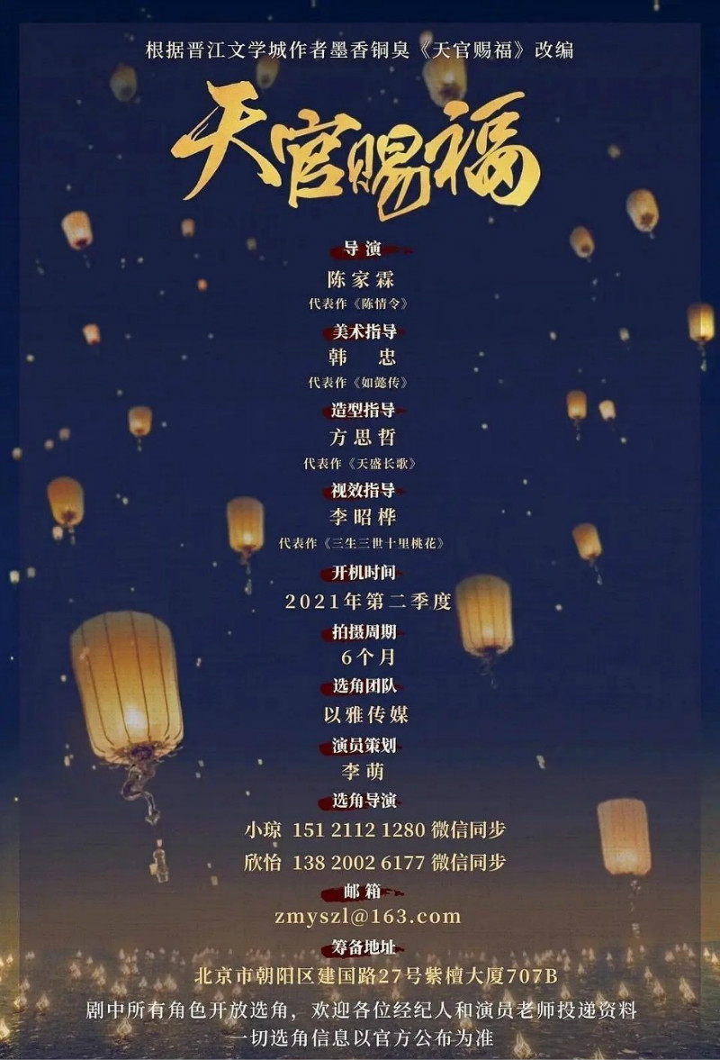 而根據現在流出的資料,《天官賜福》的影視版製作班底真的超級強!先是請來了《陳情令》導演陳家霖、《如懿傳》的美術指導、《天盛長歌》的造型執導、《三生三世十里桃花》的視覺效果指導!2021年第二季度開拍,開機時間6個月!!!據說這次投入了高達4千萬的製作費,絕對是超級大餅啊!