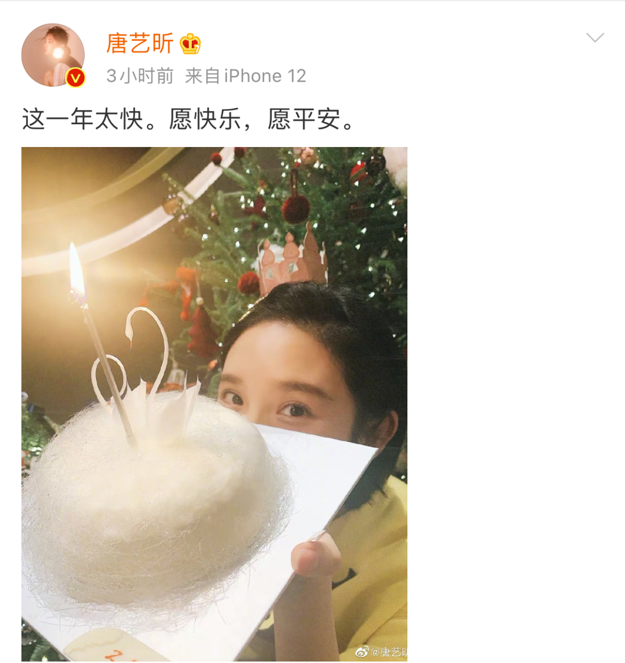 今天是唐藝昕生日,9號晚上,她發微博曬出一張手捧“白天鵝”蛋糕的慶生照,配文:「這一年太快。願快樂,願平安。」