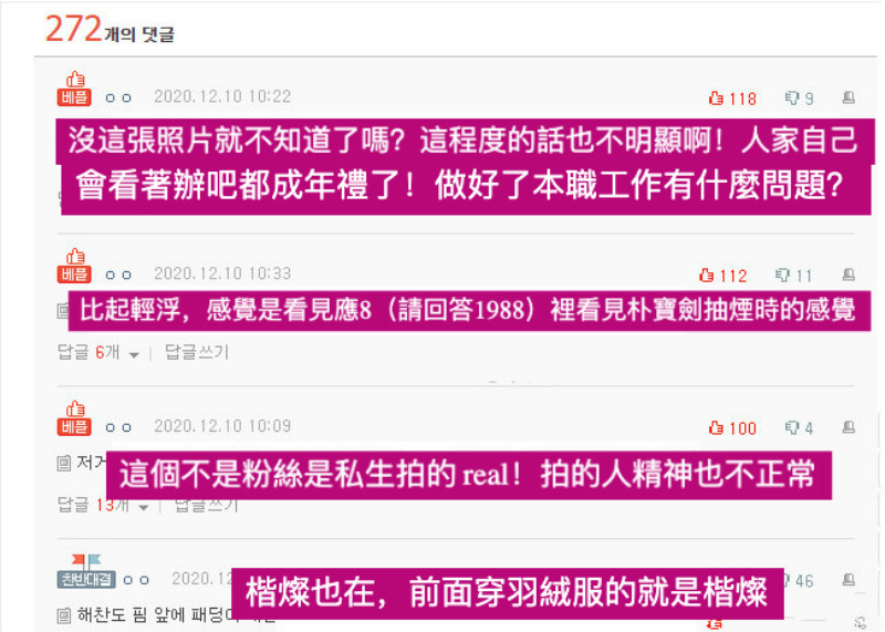 部分韓網友評論:「沒這張照片就不知道了嗎?這程度的話也不明顯啊!人家自己會看著辦吧!都成年禮了!做好了本職工作有什麼問題?」、「比起輕浮,感覺是看見應8(請回答1988)裡看見朴寶劍抽煙時的感覺」、「這個不是粉絲是私生拍的 real!拍的人精神也不正常」、「楷燦也在,前面穿羽絨服的就是楷燦」