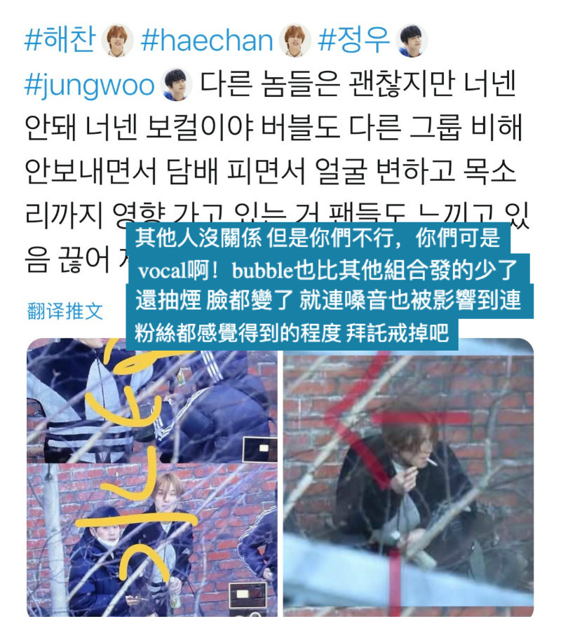 原推全文:「其他人沒關係,但是你們不行,你們可是vocal啊!bubble也比其他組合發的少,還抽煙,臉都變了,就連嗓音也被影響到連粉絲都感覺得到的程度,拜託戒掉吧!」