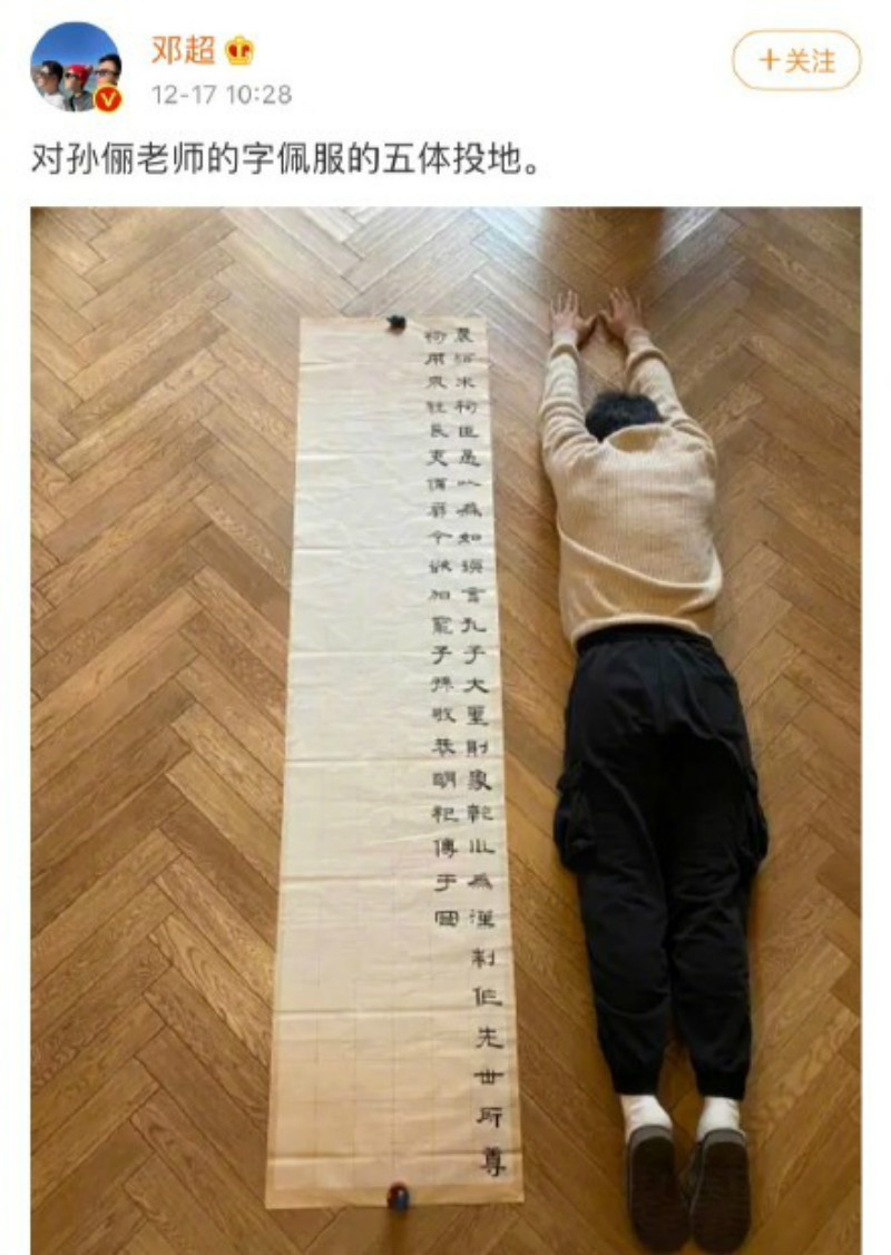 沒錯!我們超哥的沙雕日常又來了!鄧超在17號發文,表示對老婆孫俪的字佩服得五體投地!既然提到了“五體投地”,我們超哥立刻憑實力展示“投地”!