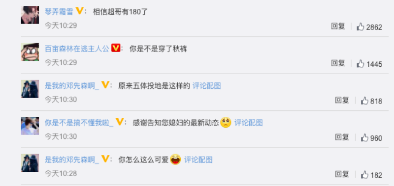 對此,粉絲紛紛留言表示:「相信超哥有180了」、「原來五體投地是這樣的」、感謝告知您媳婦的最新動態」、「你怎麽這麽可愛[哈哈] 」