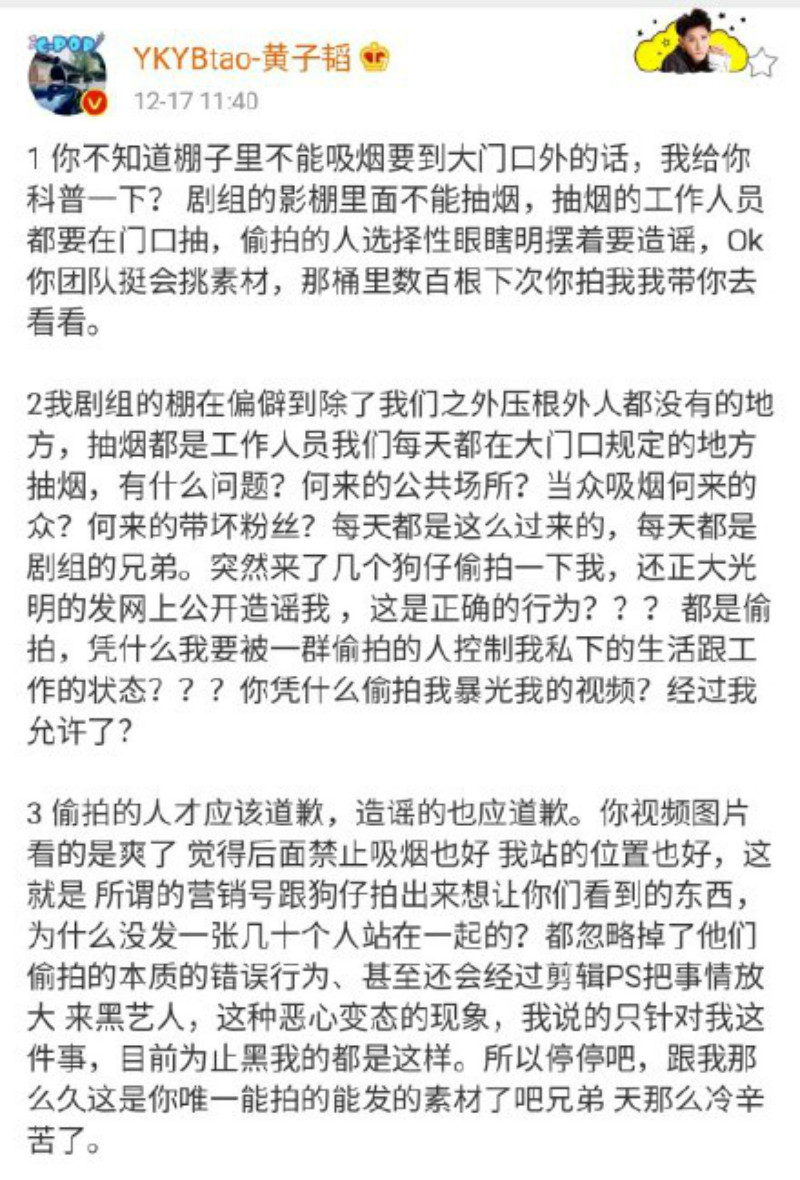 2我劇組的棚在偏僻到除了我們之外壓根外人都沒有的地方,抽煙都是工作人員我們每天都在大門口規定的地方抽煙,有什麽問題?何來的公共場所?當衆吸煙何來的衆?何來的帶壞粉絲?每天都是這麽過來的,每天都是劇組的兄弟。突然來了幾個狗仔偷拍一下我,還正大光明的發網上公開造謠我 ,這是正確的行為??? 都是偷拍,憑什麽我要被一群偷拍的人控制我私下的生活跟工作的狀態???你憑什麽偷拍我暴光我的視頻?經過我允許了?