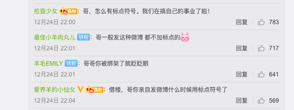 粉絲評論:「哥,怎麽有標點符號。我們在搞自己的事業了啦!」、「哥一般發這種微博 都不加標點的[兔子]」、「哥哥你被綁架了就眨眨眼」、「借樓,哥你親自發微博什麽時候用標點符號了」