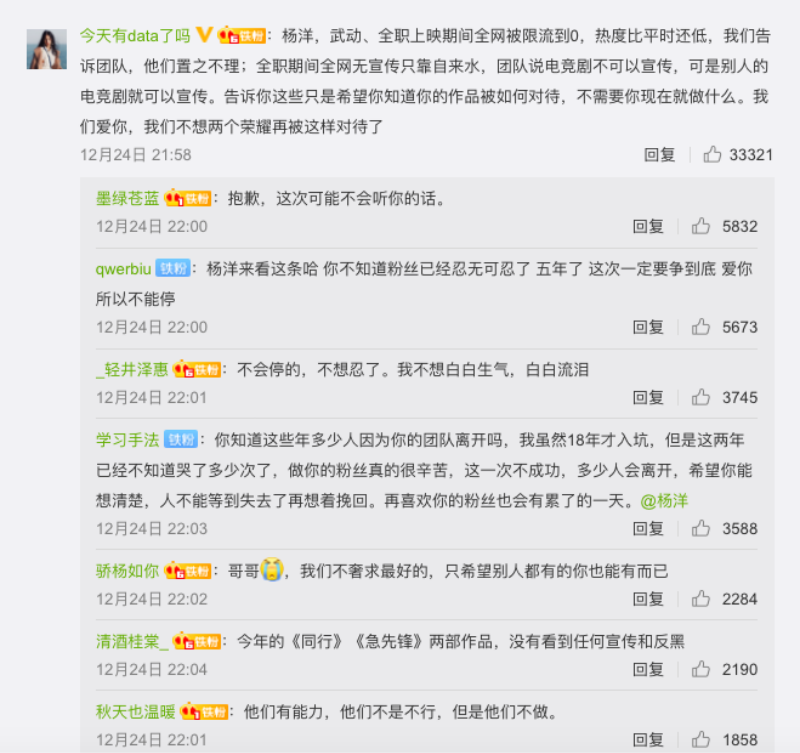 「抱歉,這次可能不會聽你的話。」「楊洋來看這條哈,你不知道粉絲已經忍無可忍了,五年了,這次一定要爭到底,愛你所以不能停」、「不會停的,不想忍了。我不想白白生氣,白白流淚」、「你知道這些年多少人因為你的團隊離開嗎,我雖然18年才入坑,但是這兩年已經不知道哭了多少次了,做你的粉絲真的很辛苦,這一次不成功,多少人會離開,希望你能想清楚,人不能等到失去了再想著挽回。再喜歡你的粉絲也會有累了的一天。」、「哥哥[淚],我們不奢求最好的,只希望別人都有的你也能有而已」、「今年的《同行》《急先鋒》兩部作品,沒有看到任何宣傳和反黑」、「他們有能力,他們不是不行,但是他們不做。」