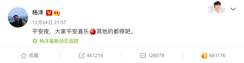 而24號平安夜,楊洋自風波以來第一次發博,只寫了一句話:「平安夜,大家平安喜樂🍎 其他的都停吧。」