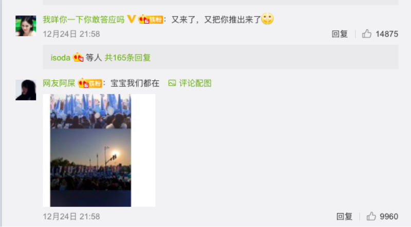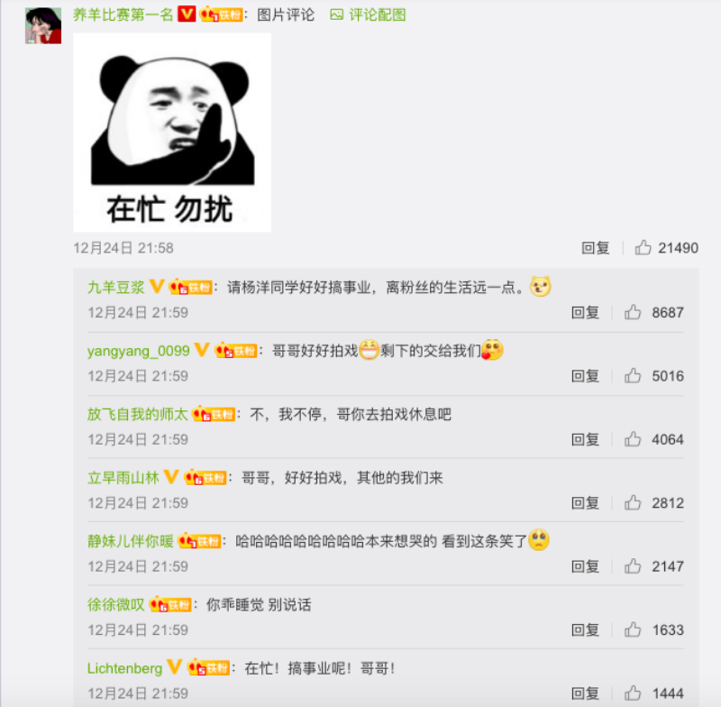 「請楊洋同學好好搞事業,離粉絲的生活遠一點。」、「哥哥好好拍戲[嘻嘻]剩下的交給我們[愛你]」、「不,我不停,哥你去拍戲休息吧」、「哥哥,好好拍戲,其他的我們來