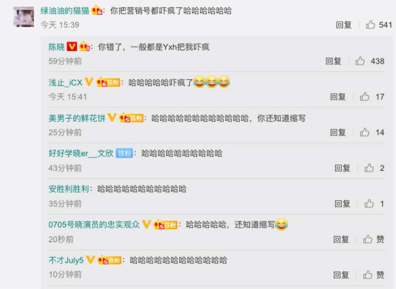 熱評第一表示:「你把營銷號都嚇瘋了哈哈哈哈哈哈!」沒想到我們的陳曉很有梗的回答:「你錯了,一般都是Yxh把我嚇瘋!」嗚呼~想不到我們的陳曉居然還會用縮寫咧!大寫的讚!有sense的回復讓評論區滿是哈哈哈哈哈哈!