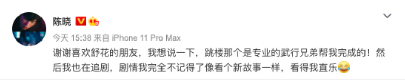 結果陳曉立刻發文表示:「我想說一下,跳樓那個是專業的武行兄弟幫我完成的!然後我也在追劇,劇情我完全不記得了像看個新故事一樣,看得我直樂。」闢謠速度比火箭還快!