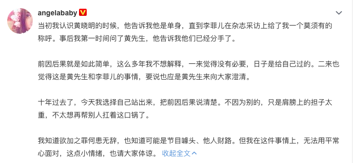 在這裡我必須要說,baby不是小三,一直以來的傳言都純屬子虛烏有,大家不要被有心網友利用而傷害到我的家人!這麽多年來我覺得沒有必要去反複提這件事,是因為我不想再被更多的人去利用這件事情博眼球,但今天我不得不說,因為我們真的受夠了。我的家人永遠是我的底線!此時此刻起,我真的希望大家不要再去傷害我的家人了!!!」