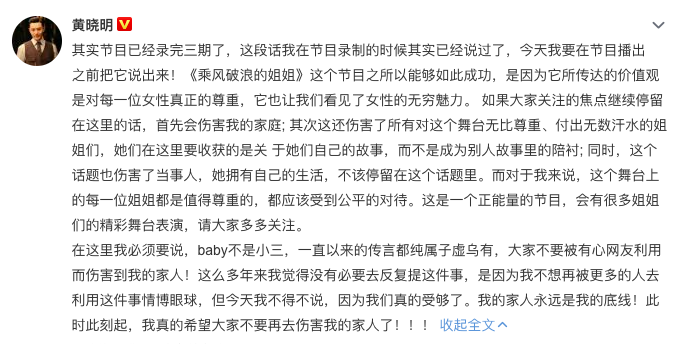 不過隨後黃曉明就發聲明文回應,表示baby不是小三!其回應全文如下:「其實節目已經錄完三期了,這段話我在節目錄制的時候其實已經說過了,今天我要在節目播出之前把它說出來!《乘⻛破浪的姐姐》這個節目之所以能夠如此成功,是因為它所傳達的價值觀是對每一位女性真正的尊重,它也讓我們看⻅了女性的無窮魅力。