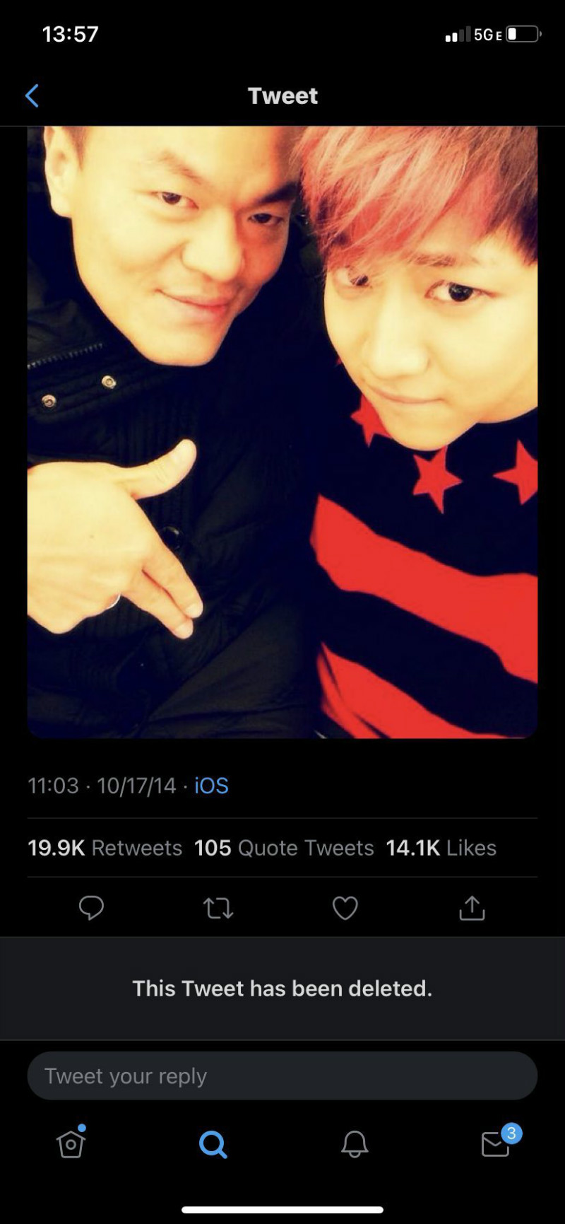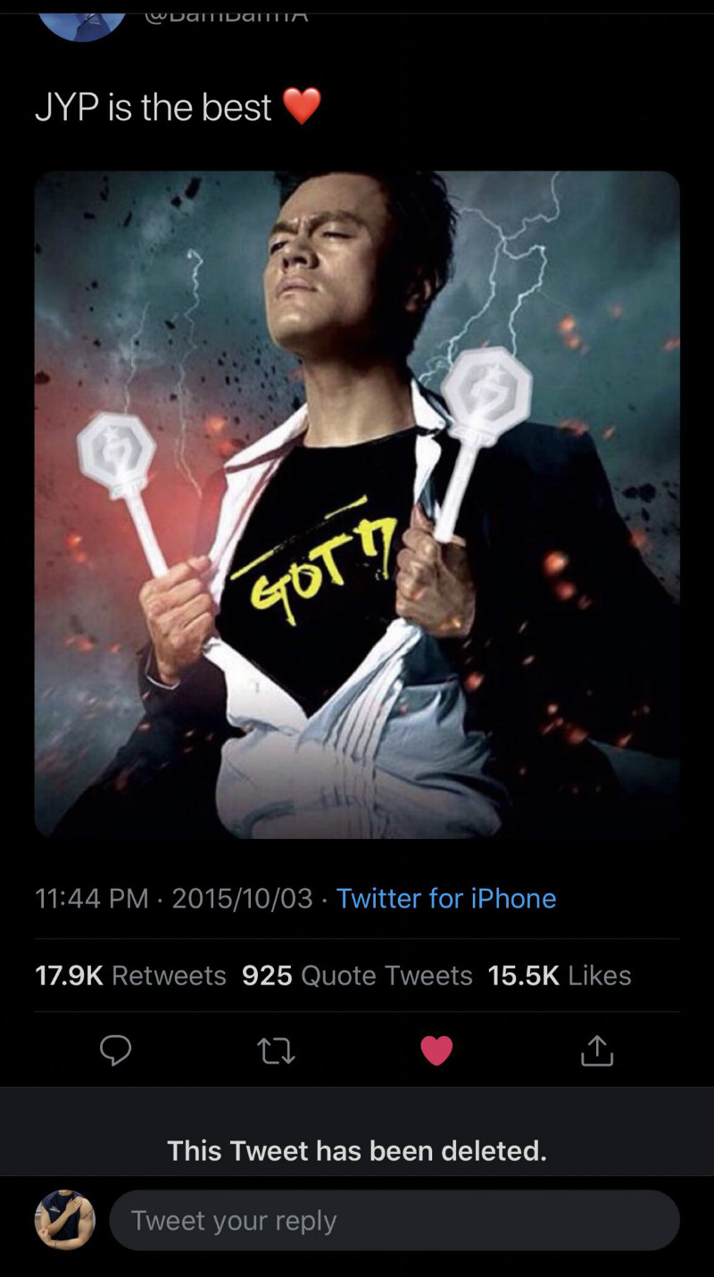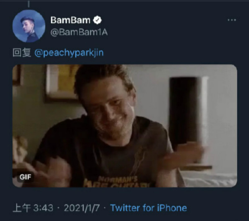 7號凌晨3點多,BamBam在推特上回復粉絲有關刪掉和JYP合照的訊息,貼出一個攤手的表情包~