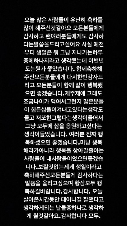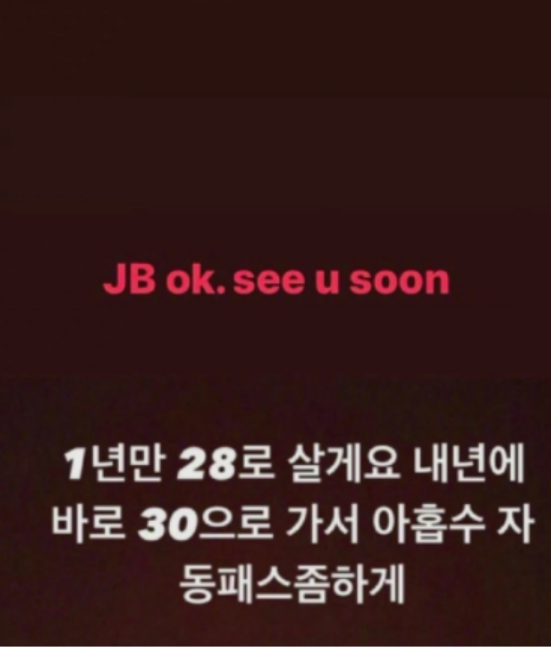 隊長JB發INS動態長文:「今天好像有很多人祝我生日快樂,我想向每一位祝我生日快樂的人說聲謝謝,也想對各位粉絲說聲謝謝。其實以前覺得生日就是普普通通度過的一天,今年好像變得更美好了。再次向各位祝我生日快樂的人說聲謝謝,希望大家都能一起幸福就好了。大概是因為我也上了點年紀,覺得大家都在努力戰勝艱難的生活,所以我也有這麽個想法,就是想為各位的生活應援。希望大家真的能幸福。即便現在不是很幸福,也希望我的人都是能找到幸福的人。感謝所有祝微不足道的我生日快樂的人,希望你們一直幸福。謝謝。覺得我出生是件好事的日子,今天也成為那些日子中的一個了。謝謝大家。」