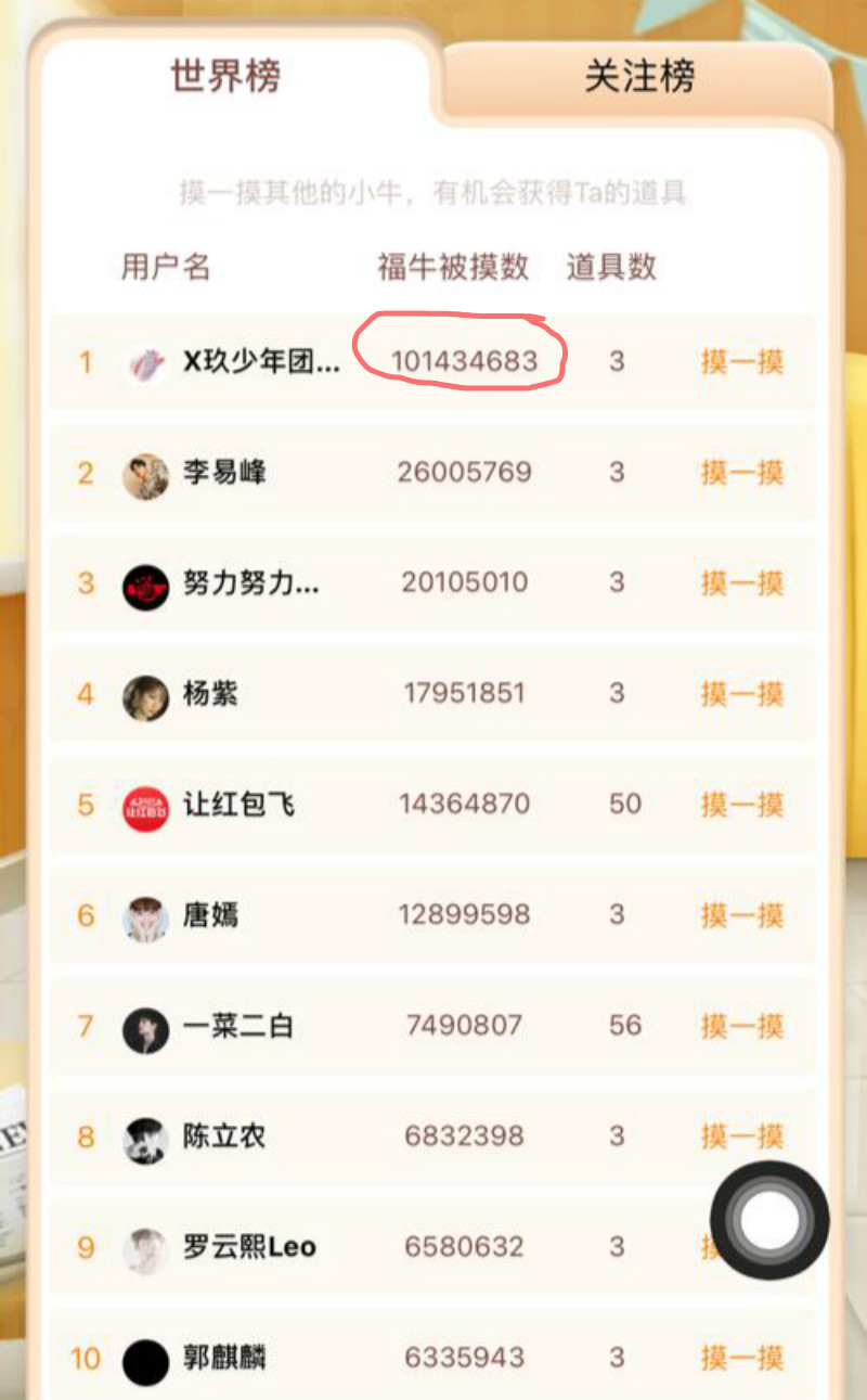 而粉絲摸牛的次數,也會記錄在排行榜上,之前排在第一名的,是在1月8號推出「易起牛」,擁有2千多萬被摸次數的李易峰福牛~
