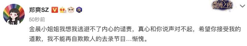 原以為事情就這麼結束了,但13號鄭爽突然發文表示:「金晨小姐姐我想我逃避不了內心的譴責,真心和你說聲對不起,希望你接受我的道歉,我不能再自欺欺人的去錄節目…慚愧」