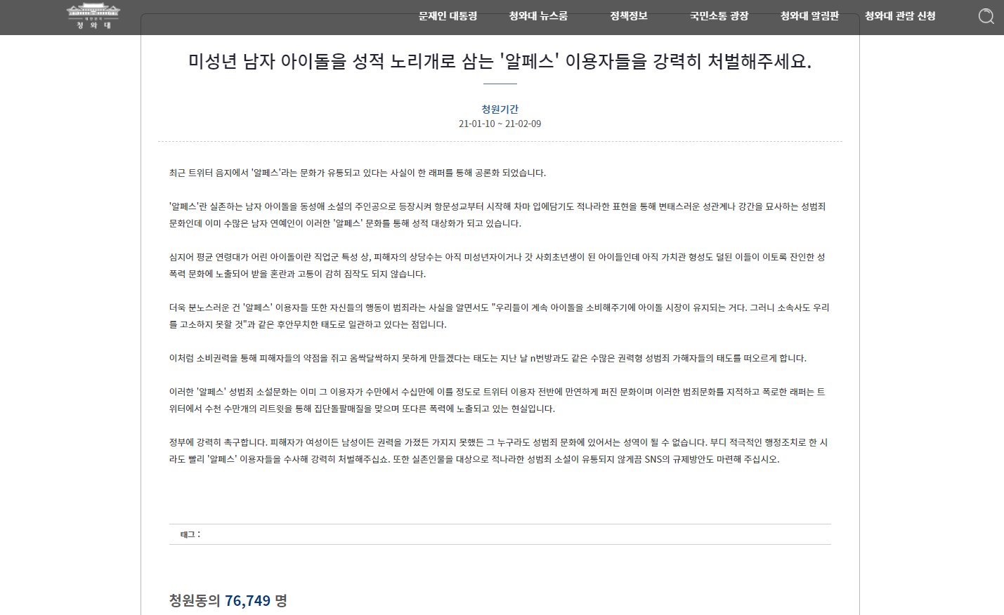 1月11日,在青瓦台國民請願留言板上,出現了“請強力處罰將未成年男藝人當作性玩物的RPS”的請願。這裡的“RPS”為“Real Person Slash”的縮寫,也就是指將真實人物作為主角的同人文。“RPS”的內容雖然題材多樣,但在這其中,最多的,還是將男藝人之間的故事寫成是同性戀的故事,把完全不存在的感情歪曲寫成是真實存在過的。