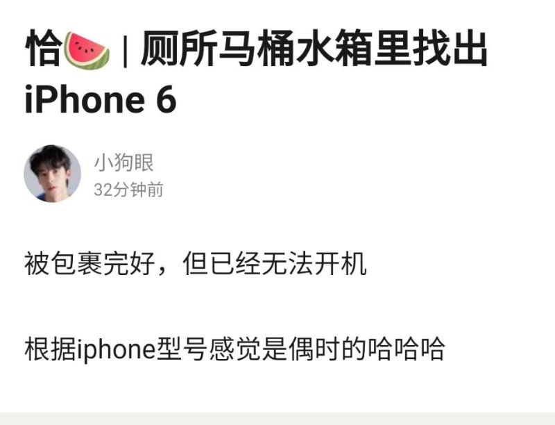 目前大廠正在錄製《青春有你3》,而有網友發文,表示居然在廁所馬桶水箱裡,找到了偶人的手機!!是噠!網傳大廠馬桶水箱裡,有包裹完好的iPhone 6,現在已經無法開機。以型號來推測,應該是偶練時期的手機,哈哈哈哈哈哈哈哈哈!這也太會藏了!孩子們為了手機太拼了!