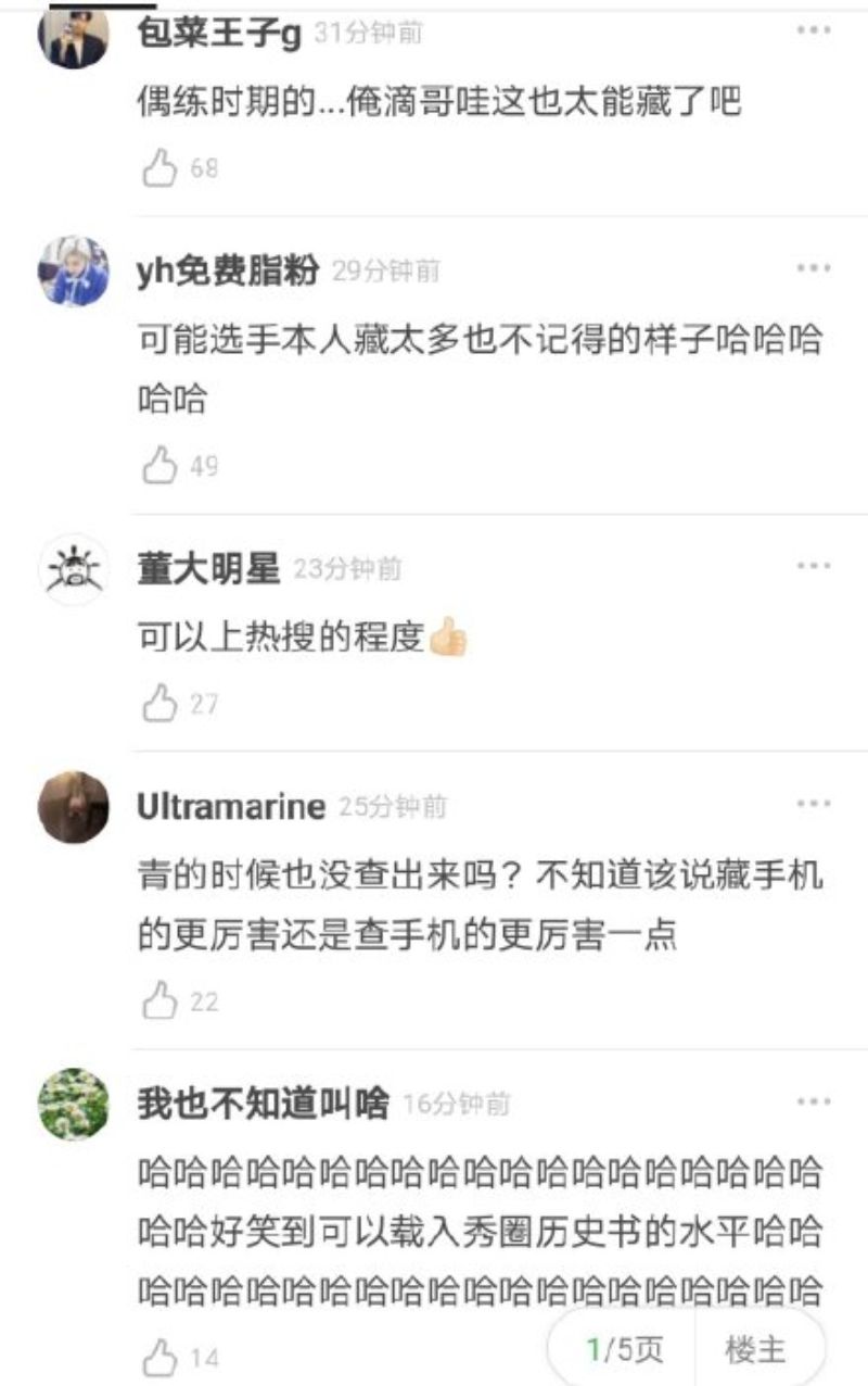 網友留言:「偶練時期的…俺滴哥哇這也太能藏了吧!」、「可能選手本人藏太多也不記得的樣子哈哈哈哈哈」、「可以上熱搜的程度」、「青的時候也沒查出來嗎?不知道該說藏手機的更厲害還是查手機的更厲害一點」、「哈哈哈哈哈哈哈哈哈哈哈哈哈哈哈哈哈哈哈好笑到可以載入秀圈歷史書的水平哈哈哈哈哈哈哈哈哈哈哈哈哈哈哈哈」