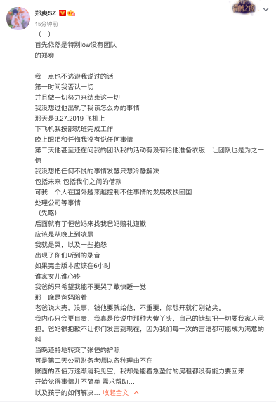 續19號中午發文回應有關代孕、棄養問題之後,鄭爽在19號晚上7點再度發長文回應,當中提及是張恆出軌,而放出的錄音版本並不是完整版,真正的完整版應該是6小時~鄭爽全文如下:被爆代孕?棄養爭議?鄭爽沉默24小時后發長文回應!新增網友解讀版!