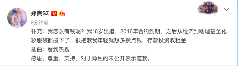 過了40分鐘,鄭爽再補充:「補充:我怎麽有錢呢?我16歲出道,2016年合約到期,之後從經濟到助理甚至化妝服裝都攬下了…很抱歉我年輕就想多攢點錢,存款投資收租金