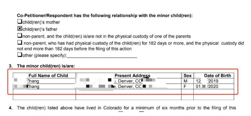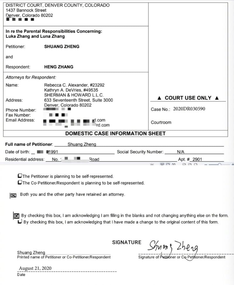鄭爽則表示2020年8月份,她正式在美國法院起訴張恒爭取孩子撫養權。根據鄭爽公開的訴訟材料顯示,2020年8月21日,鄭爽作為原告(申請人)在美國科羅拉多州丹佛縣地方法院起訴張恒,案由為“有關張吉姆(化名)和張莉莉(化名)的父母責任糾紛”。訴訟信息顯示,兩個孩子為一男一女,分別出生于2019年12月××日、2020年1月××日。