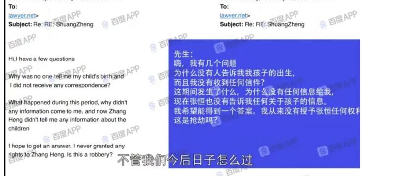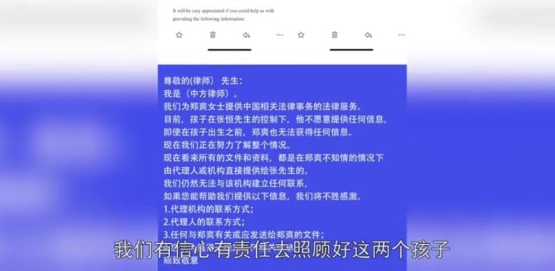 而之前鄭爽父親受訪時,也有公開了律師發給美國代孕機構的電郵,裡面表示鄭爽連自己孩子出生也沒被通知,並質問對方張恆是在搶劫嗎?