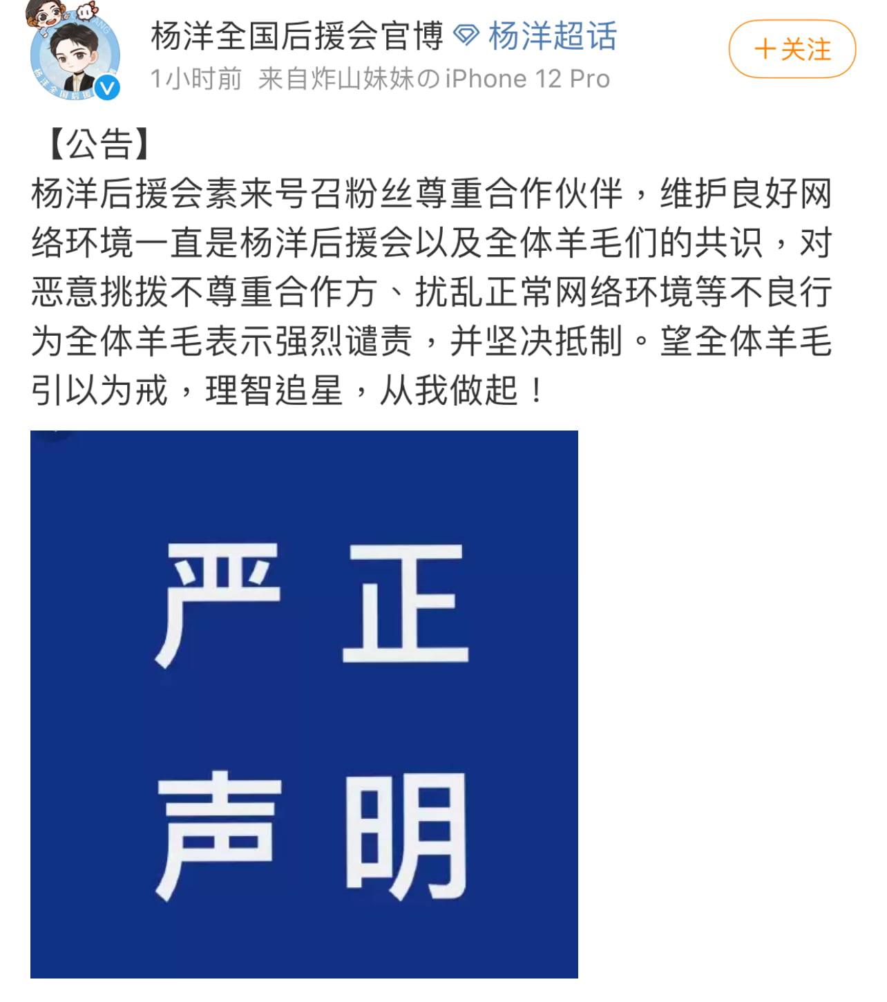 而楊洋全國後援會也發公告,表示:「楊洋後援會素來號召粉絲尊重合作夥伴,維護良好網絡環境一直是楊洋後援會以及全體羊毛們的共識,對惡意挑撥不尊重合作方、擾亂正常網絡環境等不良行為全體羊毛表示強烈譴責,並堅決抵制。望全體羊毛引以為戒,理智追星,從我做起! 」