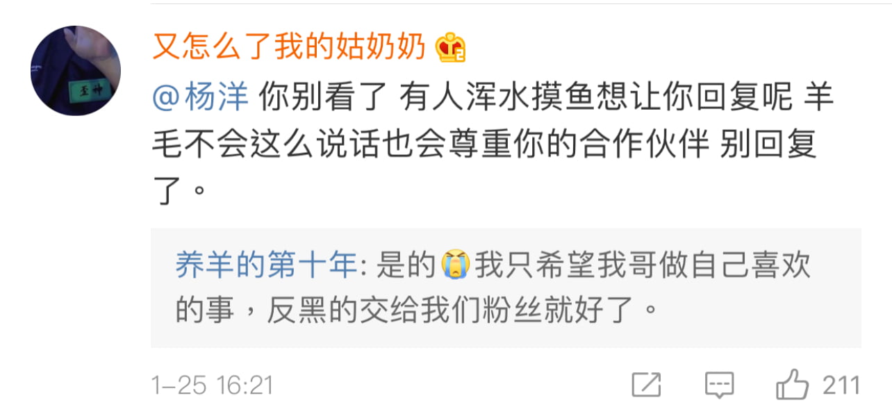 當然也有理智的粉絲喊話楊洋:「你別看了,有人渾水摸魚想讓你回復呢!羊毛不會這麽說話也會尊重你的合作夥伴,別回複了。」、「是的[淚]我只希望我哥做自己喜歡的事,反黑的交給我們粉絲就好了。」