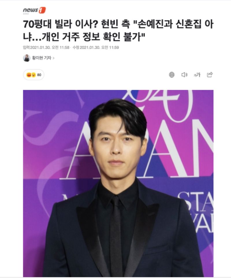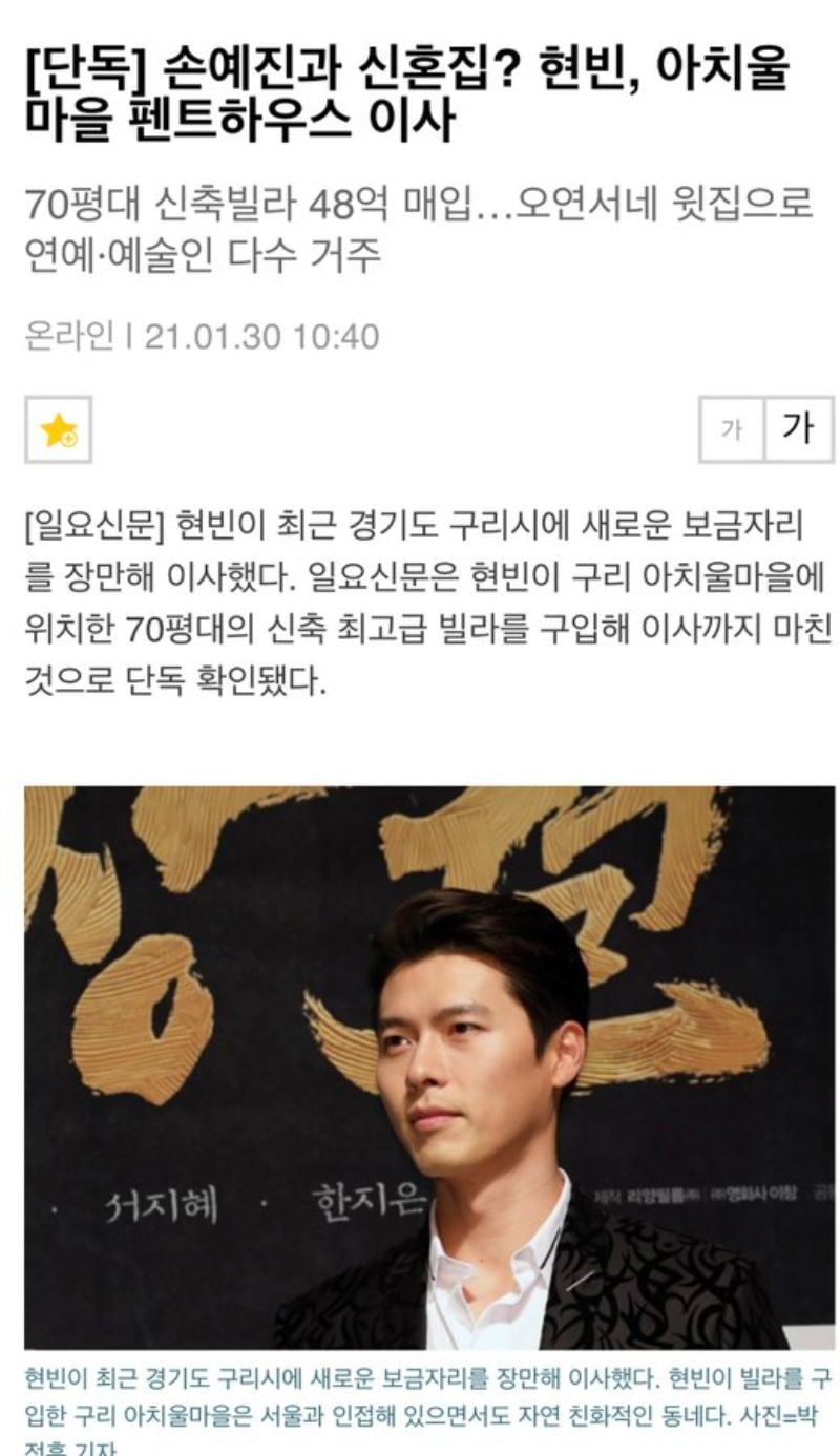 據悉玄彬是在2020年6月,以48億韓元購入這棟頂級豪宅。報道稱房屋是在1月完成過戶,因為之前一直空置,玄彬于去年12月搬入新居。小區住戶受訪表示,這裡是玄彬和孫藝珍的婚房,都知道玄彬在12月搬入,但暫時還沒有人看到玄彬現身。