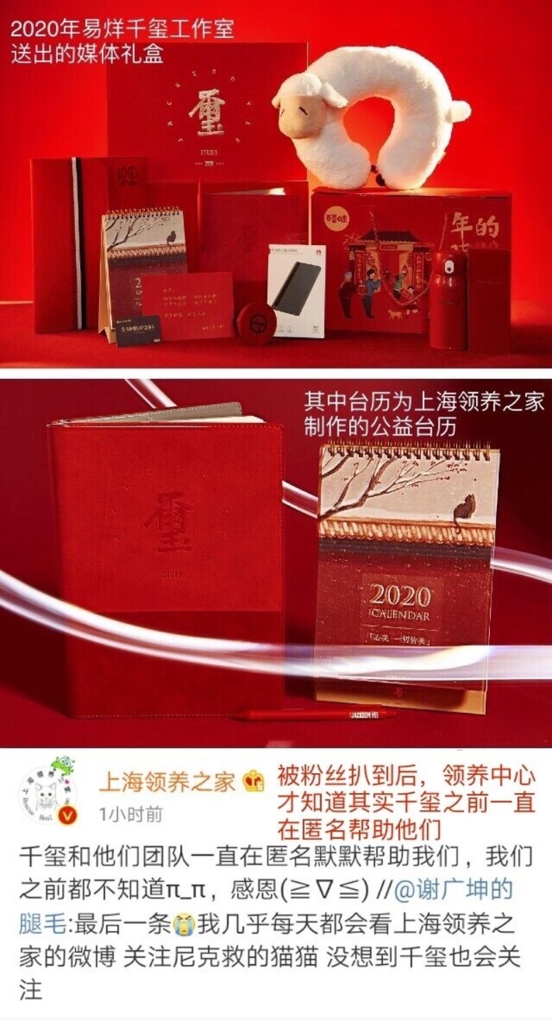 是噠!有媒體公開了易烊千玺工作室的新年禮盒,結果發現裡面有領養之家的2021年台曆!!領養之家是一家收留流浪貓的機構,每年都需要大量經費~