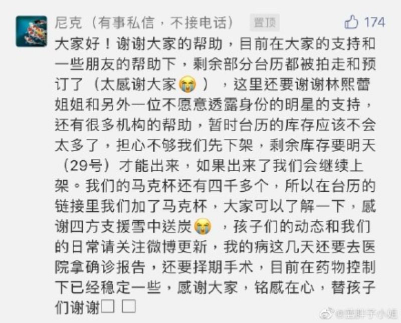 每年的台曆都是預售的,但今年很多預定出去的台曆,在台曆投産後發生了很多退貨,雖然一早註明是12月中下旬發貨,但是還是有很多的好心人等不住退款了,導致最後台曆還剩余一萬多本。文章發出之後,沒多久負責人就發文,表示台曆大部分都被好心人拍走了,還特別謝謝林熙蕾及另一位不願意透露身份的明星的支持。