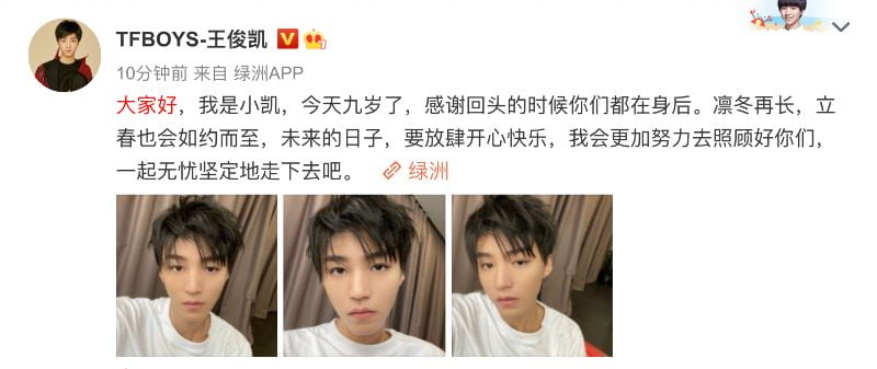 果然,儀式感滿滿的小凱,在2021年的2月3日,又更新了自己開通微博9週年紀念的貼文!格式一如既往,都以:「大家好,我是小凱,今天X歲了」為貼文開始~而今年還更新了3張自拍!!!