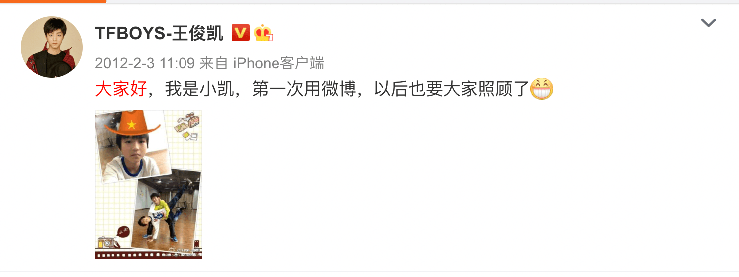 沒錯!如果你是小螃蟹,一定知道王俊凱每年的2月3日都會發微博,原因?因為他是在2012年2月3日開通了微博,發了第一則微博!