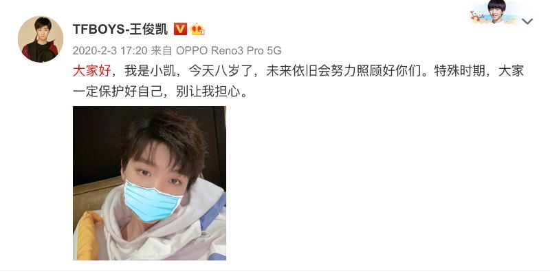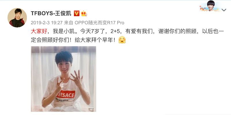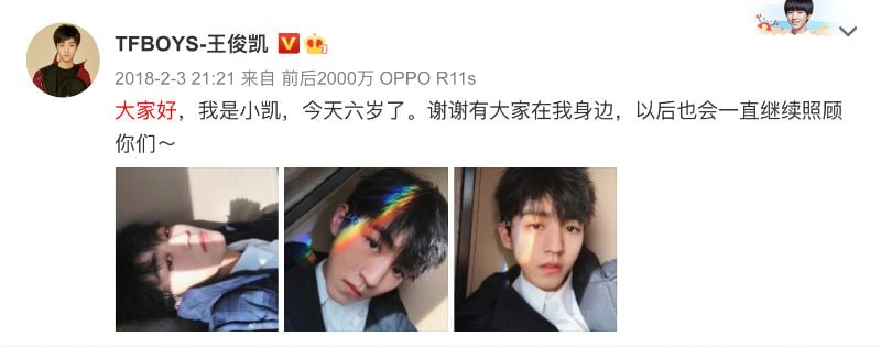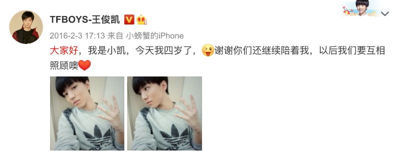 沒錯!如果你是小螃蟹,一定知道王俊凱每年的2月3日都會發微博,原因?因為他是在2012年2月3日開通了微博,發了第一則微博!