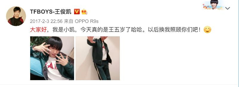 2012年,也是小凱人生中第一則微博是這樣子的:「大家好,我是小凱,第一次用微博,以後也要大家照顧了[嘻嘻] 」