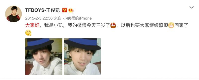 2015年的貼文:「大家好,我是小凱,我的微博今天三歲了[蛋糕],以後也要大家繼續照顧[嘻嘻]回家了[拜拜]」